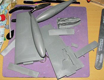 Sticking with my old ways, the first thing I did was to look for sub assemblies. As I removed sprues from their polybags, I clipped what was a viable subassembly, cemented it together and then moved to the next polybag. In this way, I tackled the wing tip tanks, nose gear well, ailerons, flaps, horizontal stabilizers and some others. What I like is that, for the most part, the sprue attachment points are on a flat portion of the part so one simply sands them away. Of course, this led me to do a bit of oversanding on just about every part so the requisite filler was needed. For the most part, I used super glue for filler as it won't shrink.