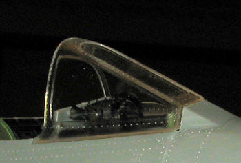 The canopy was masked and painted white to represent the hold down straps. Then the white was masked and rest painted aluminum. Hobby Boss missed a seam line on the front of the canopy. The white straps do not go all the way to the front in the photos I've seen so you need to make that demarcation yourself. The canopy vent has what looks like a metallic near center so I duplicated that. It could be clear, but I've not seen a close up of this area to verify that. The ARN-6 antenna and other bits that move with the canopy were painted, drybrushed and glued in place using clear gloss paint.