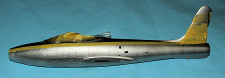 I continued with the painting and masked off several sections of the fuselage to get the dark aluminum treatment. As a note, I even painted the rudder and the fin with different shades, but later realized that the decals will cover these areas completely. Lesson on thinking ahead, I'd say. Then I started applying fuselage decals. Started with the yellow nose band and while it was quite an experience to get it in place, it fit well. The yellow isn't as opaque as I'd hoped and where it overlaps, it is a more intense shade. Still, with care and cutting of the large markings, things went on.