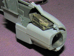 lso glued the intake section together and painted the inside aluminum using Humbrol #11. This part was then glued into the left fuselage half. The interior was then snapped into place to be sure everything dried in proper alignment. Three grams of weight was then added atop the intake section. This is a relatively large piece of weight and there isn't a ton of room, but I eventually got it to fit.