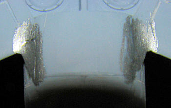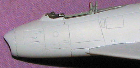 d wing root area and the intake piece where the nose section wouldn't fit quite all the way as you can see from the image. As a bit of an aside, when I am doing filler work and have trouble determining if more has to be done, I use silver paint over the area as it quickly will show seams that are not normally visible. You can see in the small image of the lower wing root how the area on the right is OK, but the on the left still needs a bit more work. It is quick, easy and saves one from having to go back over something late in the build.