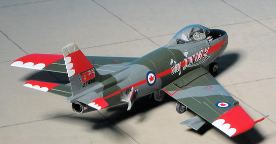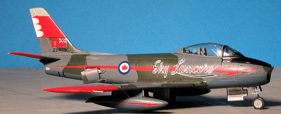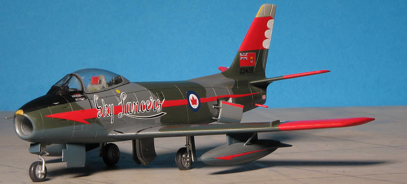 This one would be an RCAF plane from the Sky Lancers aerobatic team in 1956. This meant Dark Green, Dark Sea Grey over PRU Blue. I used an unknown acrylic for the blue and painted everything that would be this shade. Then the lower fuselage and wings and tailplanes were masked over and the upper surfaces painted Dark Green using Testors Model Master enamels. With that done, the green areas were masked and the rest of the airframe painted Dar