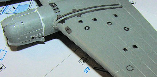 quite good though there is a bit of a gap on the upper wing root that was filled. Then I started applying the photo etch bits to the wings. P.e. easily triples or quadruples the build time for me due to the care needed to apply the bits. It is not hard work, just something that requires careful application. With all the fuselage and wing p.e. installed, I masked the cockpit transparencies and glued it in place. There are some gaps, but I'll live with them. It seemed like a good time to paint, so I headed for the paint booth. | COLORS & MARKINGS |