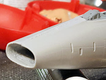 I should mention that any more, I prepaint a lot of areas of the kit before gluing, Seems to help, but I do wonder why the outside of the intake is supposed to be painted as you'll never see it. The interior/intake/nosegear well piece was then installed. It is a very positive fit. It also mates with the speed brake well of your choice (I picked the early version) and so that has to be attached along with the intake bit. The exhaust was glued in the area designated for it and to be sure, I added some nose weight, though none was called out. All of these pieces are a bit tight, but if you get it right, they will literally click into place. The piece in front of the instrument panel was installed and the fuselage halves glued together.