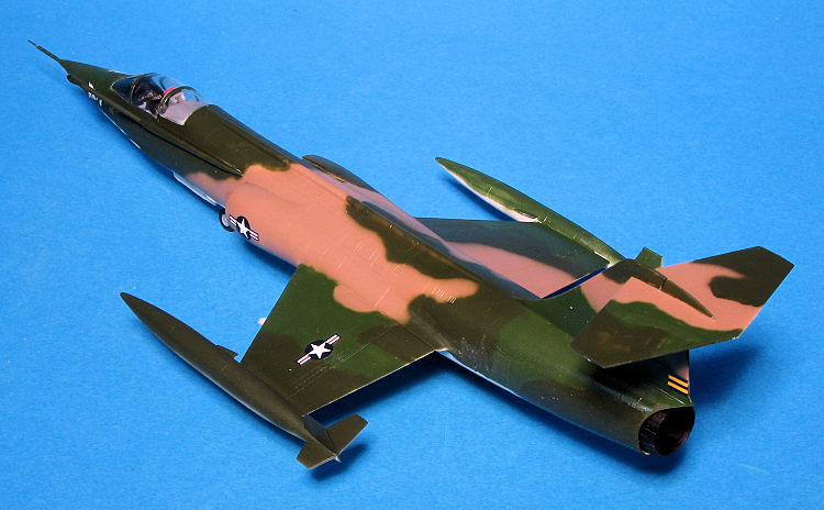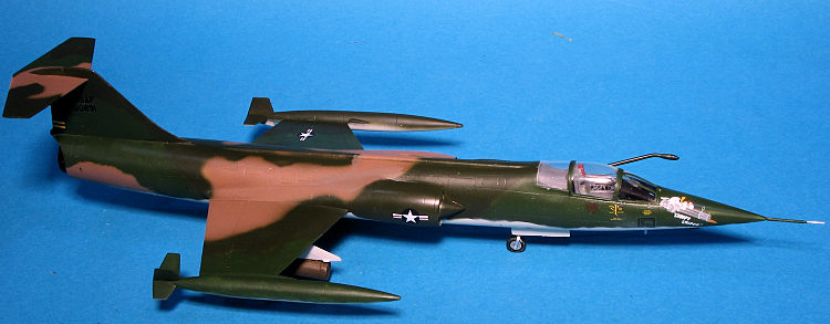 For this kit, I used Caracal CD 72064, F-104C in Vietnam. There are a number of very nice options all but two camouflaged. Model Master enamels were used for the SEA camouflage schemes as I have quite a stockpile of these colors, bought when Model Master announced it was curtailing them in favor of acrylics. I started with the underside, then on the top went from lighter to darker. All were hand sprayed, and it is here that my fuzzy sight caused me the most problem. Eventually I got all the colors in place.