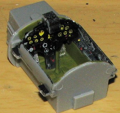 I then started assembling the cockpit and the seat. The seat has a bunch of parts and as usual, I'll install that item near the end of the build. The instrument panel has a two-piece decal that fits quite well and worked well with Mr. Mark Softer setting solution. The tub below the side panels was painted Interior Green using up some of the last of my Polly Scale paint. Everything above the side consoles is black and that includes the small side panels. Rudder pedals were painted aluminum. The black sections were dry brushed to bring out some detail and a bit of red and yellow as sparingly used to pick out a few details. The gun sight is three pieces and once the first two were assembled, it was glued atop the instrument panel. It all looks decent enough though I'm sure a resin cockpit will be even more detailed.