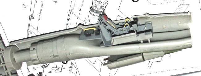 Moveing to the nose gear well, you have a choice of finned or lobed nose wheels so check your references to see which is appropriate for what you are building. The base of the nose gear well is molded into the bottom of the forward intake section. You then add the fore and side bulkheads to it with the rear bulkhead being part of the seven piece missile tray well. The kit does provide a complete intake that goes all the way to the intake compressor face of the engine.