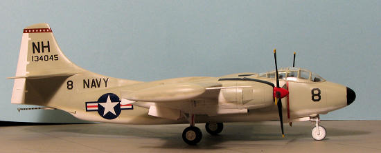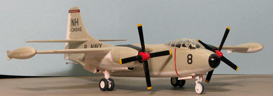 Once all that masking was done, I sprayed on the matte light gull grey, using what was left of my Aeromaster enamel to do so. The demarcation lines are not razor sharp as many times the original paint job was oversprayed by a bored sailor with a rattle can, dreaming of the next port of call while assigned to corrosion control. Been there, done that so I know of what I speak. After all of that had dried, the masking was removed and I found that some of the black on the nacelles had peeled up with the tape. Happens on EVERY resin kit I build. After the touchup, the upper surface was given a couple of coats of Future in preparation for the decals. Anigrand's decals are quite good, though relatively impervious to setting solutions. Even using Solvaset, I was unable to get them to properly snuggle down. It was here that I deviated again from the instructions. For whatever reason, no serial number is provided. Again, every photo I've seen of this plane in this scheme has it prominently placed on the fin. Fortunately, I have an older Superscale sheet that has numbers in the right size and font so I chose one from the serial sequence for the AJ-2 and applied it. I also applied black stripe decal sections around the tail hook. Just for the record, though not noted in the instructions, it appears that this plane was assigned to VAH-7. I found several photos showing the same tail band, though in different colors and all were from this unit.