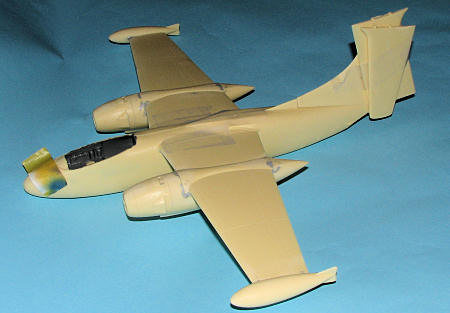 On this kit, the first actual assembly was on the wings. There are two engine nacelle halves per side and a wing tip tank. It is very handy to have a low speed motor tool with several different shaped grinding bits to get the parts cleaned up. Everything took multiple test fits to be sure there were no problems. On the engine nacelles, I simply dropped in the engine facings before gluing the halves together. They fit quite snugly in there with no need for cement. There is the need for filler on the nacelles and when attaching them, but the overall fit of these parts is quite good. This was one area where I had to do some extra sanding to get a good fit. The tip tanks were also a very good fit. Having them installed made it easier to fill the couple of air voids that I found on the wing tips.