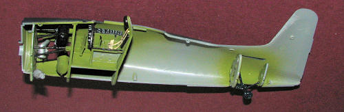 Perhaps a bit early to be in this section, seeing as how the fuselage halves are not yet joined, but thanks to all the various openings, I felt it best to paint many of the parts prior to attaching them. Now this does not speed up construction as not only do parts get painted on the sprues, but after clean up, they have to be painted again, though this is not as onerous as one might think as the second time around, there are already painted areas to hold the part. Anyway, I decided to go the Interior Green route with all the fuselage cavities as stated in the instructions. However, the gear wells and inside doors were painted with the exterior shade; gloss sea blue. Using Testors enamel for this shade also increased build time as even thinning with lacquer thinner, the paint takes a day or two to cure past being a bit sticky. You can pick it up briefly without any damage to the finish, but it feels sticky.