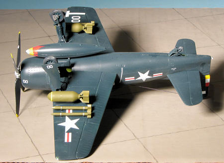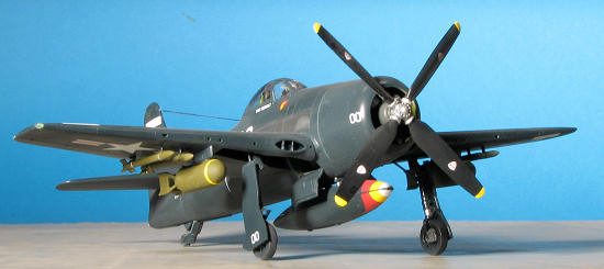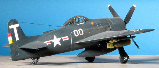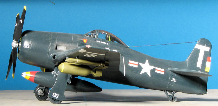 Once the markings were in place, all the gear doors and weapons were glued in place. I did my usual horrible job of painting on the yellow ring around the bombs. I was also surprised that these have no fuses on the nose, something that I figure needs to be there. The rockets had the stubs painted sea blue with metal bands. A neat touch for the main gear doors is that the pegs on the doors fit into sockets on the gear. Nice and neat. I sprayed the kit with a semi-matte clear then attached a radio wire using large EZ-Line after drilling holes in the canopy and fin. Next time, I'll stick with the small stuff. I was going to pose the canopy open, but I tacked it in place so well it would not easily come loose. Besides, I already attached the radio wire. Tamiya weathering kits were used for the exhaust. Sure, it is the CAG bird, and though I did not weather it, it still is a plane that would collect exhaust soot.