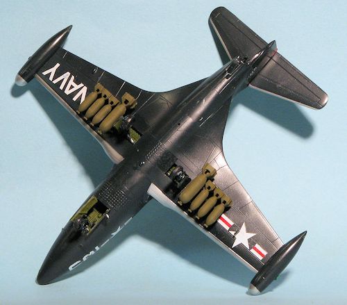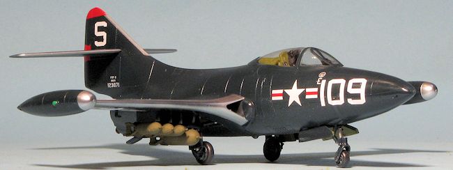 With that done, I started on the decals. For this build, I went with Starfighter Decals latest sheet; 72-141. It has markings for three planes and I chose the F9F-3 from VF-51 as flown by Len Plog for the 1st USN kill. This scheme is a bit unusual as there is no Navy or unit marking on the aft fuselage. I immediately discovered that installing the wing racks before painting wasn't a hot idea as some of the decals fit under the racks. I ran into this issue when it came to the markings under the tail planes. Those should have also been left off until after decaling. For the former, I did nothing and for the latter I ended up cutting the red wedges, a rather messy chore. I also discovered that Mr. Mark Softer is too strong and some decals had the ink run. However, Microsol is too weak and will cause issues with silvering.