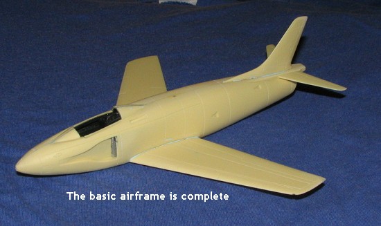 Next was to attach the fin. This required that the mating surface be flat so a bit of sanding was needed. I also filled in the upper exhaust area to get it a bit smoother. Once the fin was in place, I glued on the wings. These have an alignment pin and the fit is quite good. I had to be sure there was no dihedral on the wings as these are quite flat. The inevitable gaps were filled with super glue. Same went for the tail planes. These are butt joined and have to be flat. Once these were in place, I had a pretty complete airframe.