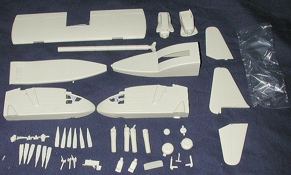 The kit is molded in the usual tan resin and consists of 32 pieces, many of them for the engines. Surface detail is quite good and on a par with the XF-109 that was built recently. The kit provides an interior complete with seats, control wheels, console and instrument panel. There is a decal for the instrument panel. The wing is a solid and hefty chunk of resin onto which the engine pods are places. Each engine consists of two engine/exhaust combos and an eight piece contra-rotating prop assembly. The wing can be displayed in any range of its tilt. The builder must make some short tilt actuating pistons from 1mm rod.