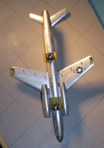 For the last steps, I pushed the compressor faces into the engine pods. Then, I shoved the exhaust into the back of the aft engine and one pod. Tight fit, but no problem and no glue. However, on the left pod, when I pushed it in, it split the seam on the pod! ARRGH! I left it alone and just shook my head. These things always happen at the end. Final steps were to remove the masking from the canopy and glue on the lower nose pitot. Having broken one of the side pitots, I left those off. A bit of touch-up painting and I was done.
