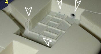 The final shot (image 4) shows the main wheel well. In here are a number of air bubbles and these will, for the most part, not be an easy fix. This is especially true of those that are in the wheel well roof detail section. These were probably made from Evergreen strip styrene on the master. In order to repair them, I'm going to have to assume that removing the bad sections and replacing them with more strip styrene is the only answer if you want a contest quality kit.