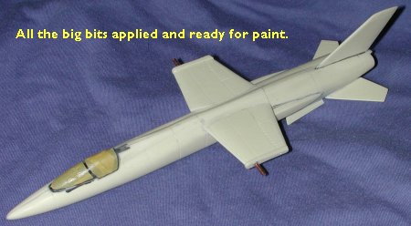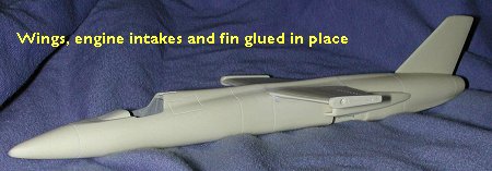 With that done, the wings were fit. These are very small; like on an F-104, and took a lot of fussing to get them to fit properly. The joins were quite large and I used superglue on the upper ones. Once carefully sanded down, the rest of the join seams were filled using Mr. Surfacer 500 that has thickened up quite a bit since bought new. It is now more the consistency of toothpaste and though it takes a bit longer to dry, it does fill fairly well.