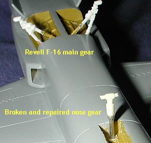 Nothing to do then but damage control. I found the part that holds the nose wheels, drilled it out and inserted a section of paper clip. The now broken stub left in the gear bay was drilled as well and the new, but stronger, nose gear was glued in. A short retraction strut was glued on there as well. The wheels were next and after painting (aluminum wheel) they were glued in place. The main wheels were a tad loose on the Revell gear, but nothing major. The gear doors and the lower antenna/pitot thingie were then glued in place. Gear doors fit well enough even though I'd managed to break a few tabs in the process. The nose gear doors had to be sawn in half as they are molded together. Doors really are way too thick and some of you who actually build this kit may want to replace them or drastically thin them.