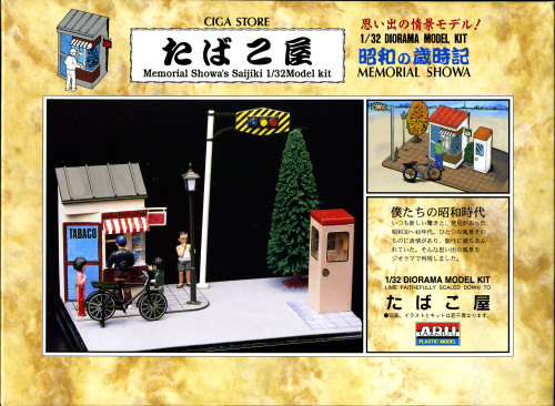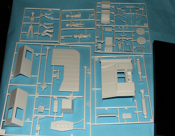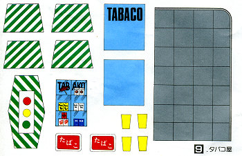 pine tree, though it is shown on the box top. Both the tobacco shop and the phone booth have their own plastic base that is divided into squares. To hold the entire diorama, a black base is provided for the builder to paint as he sees fit. A sheet of clear acetate is also included for the windows of the shop and phone booth.