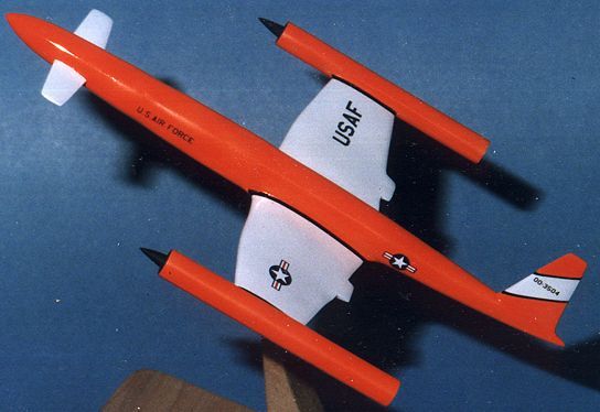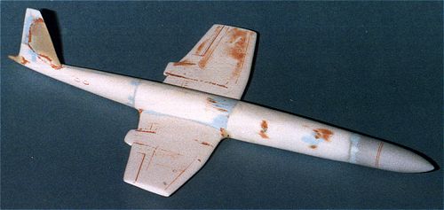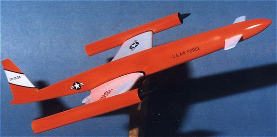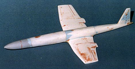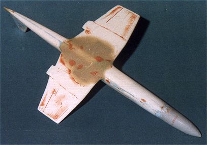 After primer (and more filling and sanding), the entire airframe was paintedgloss white as in the 1953 image. It looked very blah! It needed somecolor. Thinking back to a trip to Tyndall AFB and a tour of the dronefacilities, I decided that this would be a hypersonic drone. Dronesare always very colorful. What better color than Day-Glo! Humbrolgloss Blaze was the paint of choice. Unlike other day-glo paints, thiscovered very well and was not the pain it could have been. It is more ofan orange than a red and is really bright in the sunlight. The wingsthemselves and a section of tail were kept white. Decals were usedat the wing roots and tips to set off the different colors. Decalscame from the spares box and various Scalemaster sheets. It was then plunkedon a stand. Overall, a rather interesting diversion from the norm.While it did not win the contest, it looks great and is a big change fromthe usual Tamiya/Hasegawa/Italeri.......kits that I normally build.