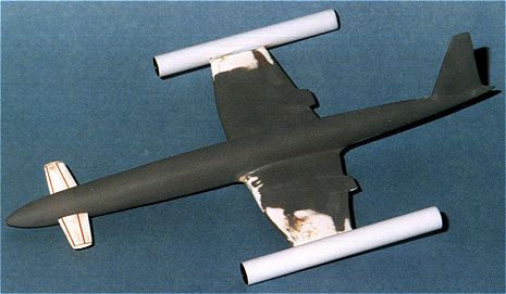 Our club had a contest that required one to use a Merlin kit. One coulddo anything to the kit as long as 50% of the kit was used. My decisionwas to use the Meteor F.8 kit to build a futuristic aircraft. The ideacame from a book I have celebrating the 50th anniversary of flight back in1953. On the last page of the book was an artists rendition of a hypersonicinterceptor of the future (like 1970). It was clean looking and appearedto be a powered by two wingtip-mounted ramjets. So, I used it as a basisfor my kit.