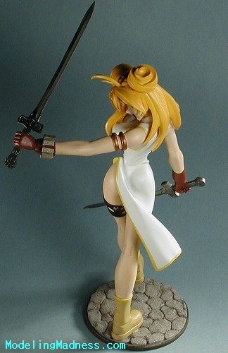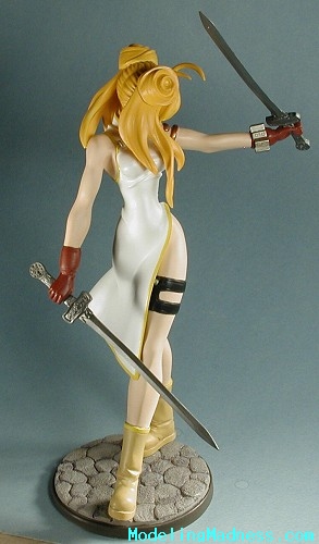 With that done, the last parts to attach were the hands with the swords. But before that, I decided to at least get the figure onto the base. After figuring the best place to put it, I drilled a hole in the base and then, using copious amounts of superglue, attached the rear foot to the base. With things nice and sturdy, I then glued on the little gold 'bits' to the one glove and then glued the two hands onto the arms. Attaching a small section of 'hair' was the final bit and I was pretty much done. I did have to do quite a bit of touch-up in various areas as handling had worn off some of the paint. Then the entire figure was given a coat of matte clear to cut down on the shine of some of the parts.