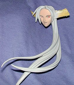 Last parts to be glued on were the sections of hair just below the ears. These needed some ribbons on them. I went to a place that sells ribbons and bought some red ones that I could cut. These were trimmed into small sections and tied onto the appropriate areas on the figure. I'll have to find something more flexible next time as I found the one I bought to be too stiff. These sections were glued in place. Then the resin section was glued in place with the ribbon covering much of the join. The sword was a real tricky part of the kit. It seemed more like an afterthought as anything else. There seemed to be no proper way to attach it to the hands. Finally I ended up just placing in the figure's hands in a pose that seemed to match what was on the artwork that came in the box.