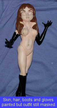 With that done (or at least close to it), I masked off the skin and painted the gloves and boots black. I then brush painted the hair using Testors leather from the enamel line. The masking was then taken off all but the outfit and the hair was given a wash using thin, black acrylic. Some other touch up was done before the masking was removed. Naturally, some touch-up was done to the outfit. In fact, I found that I had to do a LOT of touching up this, that, and everything else. The eye areas were brush