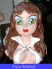 The hardest part was the eyes. I probably painted those things a half dozen times before I got the results you see. I'm still not really satisfied with them and will be trying some different techniques on the next one. The eye liner and eye shadow are a couple of shades of blue from the small Testors enamel bottles. The eyes were then given a coat of Future to make them glossy in comparison to the rest of the figure.