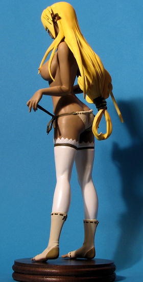 When dry, I painted the eye areas with Citadel Gloss White and the chain with Testors Gold. Nipples and lips used Badger Rose Flesh, but found it too close the actual skin color. I tried several other shades and ended up with a mix of paint to provide what I thought looked the best. The hair is shown in the photo that accompanies the kit as being white, but I already had white stockings so went with a light yellow. In this case Humbrol Linen was chosen. I ended up doing a wash with Vallejo Light Orange to darken things up a bit. The ties for the panty were painted Vallejo English Uniform color. All of this detail work was done with a brush. The gem inside the necklace was painted Vermillion using Tru-Color paint.