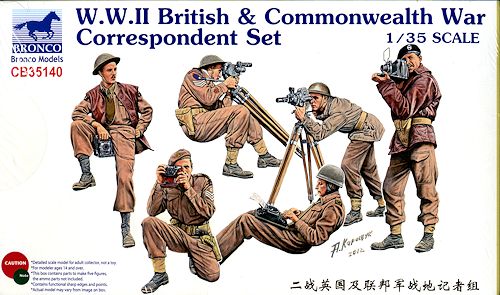 This latest figure set from Bronco is something that I have not yet seek kitted. This set includes six different war correspondents in British and Commonwealth uniforms. They are all holding tools of their trade; mostly cameras of some sort. Two have the large format cameras, two have 8mm movie cameras, one has a 35mm camera and one has a typewriter.