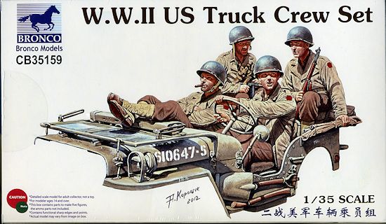 This latest figure set from Bronco is perfect for their 1/4 ton 4x4 light truck kits. It includes four figures in various poses, all of them looking rather relaxed as things go. There is a driver, a front seat passenger with his feet up on the windscreen (an officer)(which means you need to model the windscreen folded down), and a couple of guys in the back. These latter two are armed, one with a Thompson and the other with an M1. The guy with the Thompson also is holding a small dog.