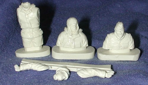 This set is basically your German tank crew of commander, driver and radio operator. They are all bundled up in their winter gear and set to place in your next Tiger or Panther tank! The commander's figure is the largest and comes with a separate head and arms so that he can be properly posed sticking out of the turret hatch. The other two figures are basically just busts as they will be peering out of the smaller hatches in the forward hull of the tank. The figures are very well cast and have handy resin pour stubs that will double nicely as bases should you choose to just leave them the way they are. Or they will make nice hand holds so that you can paint them without any worries about where to put them while drying.