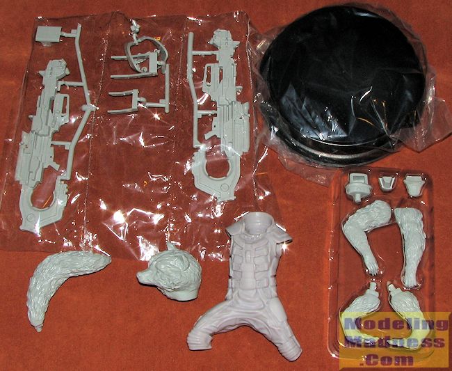 Instructions are a single sheet that has one construction step with some smaller detail sections. Colors are provided in Gunze references. Like most large scale figure kits, most of the time spent on this will be painting it. It will be especially challenging due to the large 'fur' areas that will need careful work and I'd think that an airbrush would be pretty much a requirement to get the proper blending of colors. There is no view of the back of the figure so you are on your own in this regard. I'd suggest using the movie as your best reference. Since the arms and legs and head are separate, it would probably be wise to paint these items prior to assembling the body. The kit comes with a display stand.