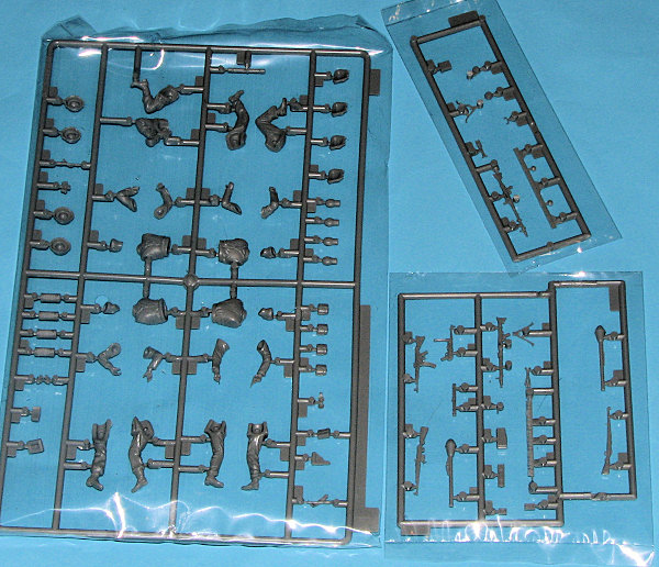 The figures are well detailed with no molding defects. Only a slight mold seam to clean up. The heads are the 'flat top' variety for the steel helmets, two of which are molded with a cloth cover. In addition to the figure sprue, there are two for weapons. One holds the machine gun (I'm guessing an MG 42) and belt while the other has the rifle that is needed for one figure. This second sprue has a bunch of other weapons that are not required for this set so you'll have a nice batch of spares. These are the 'old mold' variety without the indented barrel ends, but are still quite nicely molded.