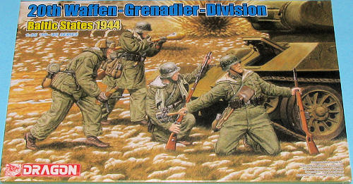Another of Dragon's fine figure sets is this one depicting four soldiers of the 20th Waffen-Grenadier Division in the Blatic states during 1944. As is typical of Dragon's figure line, this one has a lot of optional parts. In fact, there are five smaller sprues that have nothing but weapons on them. This includes some RPGs and the decal sheet that is with this set is primarily for those weapons.March 2009