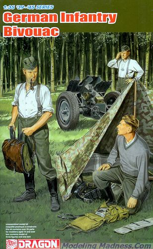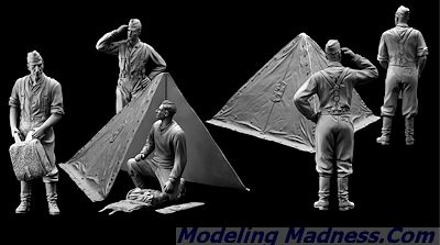 There’s a saying – ‘The army sleeps under the stars, the navy navigates by the stars, and the navy chooses its hotels by the number of stars!” This newest 1/35 scale figure set well and truly represents the former. The box contains three German Wehrmacht anti-tank crewmen along with a temporary bivouac they’ve set up in the field. This is such a typical scene on any battlefield, but no kit manufacturer has bothered to represent it thus far. Such a shelter could be swiftly created by erecting a triangular M1931 pattern Zeltbahn (‘shelter quarter’). The