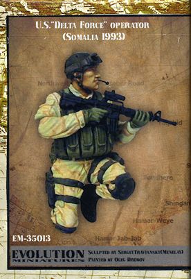 This particular figure is a Delta Force soldier as participated in the disaster in Mogadishu, Somalia back in 1993. This fellow has a pretty standard fit with his M-16, pistol and the usual stuff that these guys carry. The kit includes the kneeling figure with his left arm separate. His hands and the gun are all a single mold, which is a good way to make sure there is a proper fit. Also on the sprues is his pistol and case, two water bottles and a boom mike. Actually, the boom mike is the only part aside from the main figure, that managed to remain on the sprue. The rest of the bits broke away during shipment. I am not sure if the two small rods are parts or just part of the failed protective areas on the pour stub.