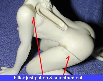 Once it is dry, take your 320 grit sandpaper and get it down to where it is close to fully smooth. Then use the 400 to get it to the final shape and the 600 to feather everything out. Any spots missed can then be fixed with superglue or with regular filler if they are thin or shallow. You can also use Mr. Surfacer or thickened lacquer primer. When that is done, do the next leg and then the arms. As you can see from the image to the right, the amount used is really minimal.
