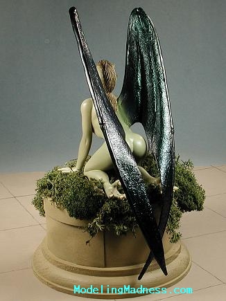 After you have a complete body, the next is the wings. These are just a superbly molded as the rest of the kit. There are nice slots cut into the back to accept the wings. These were installed one at a time to make it a bit easier to smooth out the putty. The right one is the one that needed the most filler of the two so it was installed first. It was a simple superglue job and then the epoxy putty was applied. It turned out so well that little actual sanding was needed to smooth out the area. Once the other wing was glued in and puttied, the complete figure was taken to have a coat of primer put on it. Because of the wings, you have to be rather resourceful figuring out how to set it down as you can't set it on its feet/arms as the wings hang down rather far below figure level.