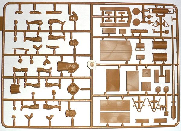 THere are three ground pounders. One is carrying a bomb on his shoulder, one is spray painting a winter wash, and the third is stuck with guard duty and does not look particularly happy about it. The set includes the guard shack and gate as well as the barrels, stand and painting equipment shown on the box top.