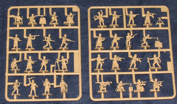 These figures are a continuation of the very popular semi-soft plastic figures that have become increasingly popular amongst the gaming crowd. There are three identical frets in each set, providing figures of various poses. What we have here are a set of German Elite Troops (actually SS, but it isn't politically wise to put that on the box). The other are Russian Infantry in Winter dress.