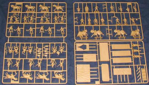 The kit consists of six sprues; the two for the majority of the particupants and various bowmen and pike men being identical. Not really sure what those folks are doing in a pleasant tournament, but I am guessing they were originally molded for another set. The riders, spears and some other bits will need to be glued on and according to the box top, you can glue these sets with normal cements, though no real details of this are provided.