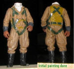 Back at the torso, I sprayed the whole thing with a matte clear to seal in the colors. I then took a bright silver paint pen and used it to transfer paint to a fine brush so I could do the buckles and harness release. A little slop meant some touchup paint. The head was then glued on as I tried to figure how to do the eyes. This is always a problem area on small scale figures as I sure didn't want a 'bug eye' effect. I settled for a strip in the upper eye socket as it seemed to be what was done from the image I had on the package.