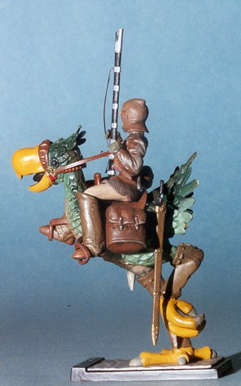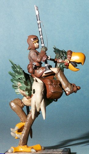 This all made the whole assembly very heavy on one side, so I added some weight to the other side of the underside of the base to compensate. Then any touchup was done and the entire kit sprayed with clear acrylic. When dry, the whole kit was washed with a thin gloss black enamel. Then matte clear was sprayed on all but the beak and feet of the kai. A bit more drybrushing was then done and the kit was complete.