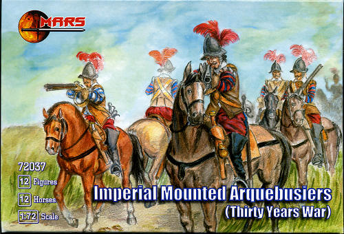 Continuing their series of semi-flexible plastic war-gaming figures, Mars offers this set of mounted troops, each carrying an arquebus. For those unfamiliar with the term, the arquebus (from Dutch haakbus, meaning "hook gun", or "hook tube"), is an early muzzle-loaded firearm used in the 15th to 17th centuries. It is basically a very early rifle and quite effective at relatively close range against armored riders.