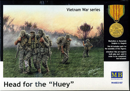 This is yet another of Master Box's interesting sets. This one is set in Vietnam and is, to my knowledge, the second set done in that theater. This time it has the five figures headed for help. There are two soldiers helping a wounded comrate with two more looking back at a smoke flare with one holding another flare or a grenade in his hand.