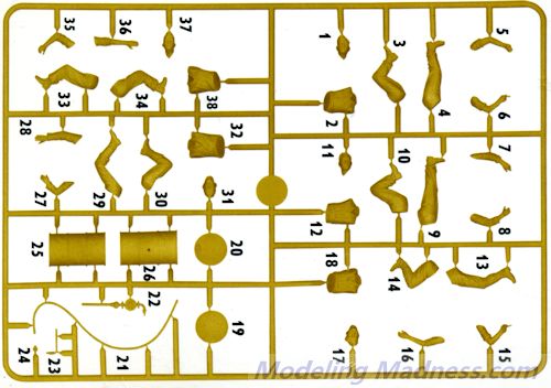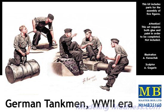 "German Tankmen, WWII era" is for 1/35 modelers. The kit relates to the World War II era and it consists of 5 figures of German tankmen. Three figures are of tankmen in various poses engaged in conversation on the turret of a tank. These figures suit any tanks that were in service with the Panzerwaffe. Two other figures are of tankmen that are dealing with fueling. These two figures can be used not only with tanks, but also with any kind of vehicle of that period, both armored and soft skin. Thus, the modeler gets two kits in one box which is especially great when creating dioramas using more than one vehicle. These latter two could also be used in a 1/32 aircraft diorama.