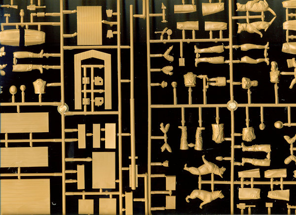 Here is an interesting idea for a figure set and diorama. This is a German checkpoint with three guards checking the identity papers of a family of three. It comes on two full sprues. The set also includes a guard house, moveable barrier and an iron vehicle barricade. Two guard dogs are also included, one standing and one sitting. Two of the guards are wearing those silver breast plates and the officer has what appears to be a white and red disc of some sort.