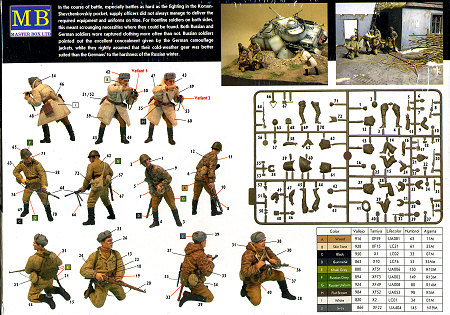 Those who have built these kits have commented on how nicely molded they are and they are generally free from sink areas or other molding glitches. The figures in this set could easily be used in other settings if one wished. The kit has no formal instructions, but the back of the box provides at least two images of the painted figures and where the parts go. Painting instructions give Vallejo, Tamiya, Lifecolour, Humbrol and Agama paint references.